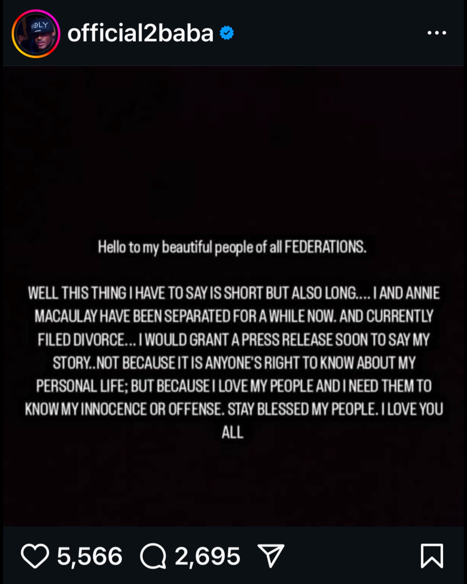 Nigerian Afrobeat legend 2 Baba has officially announced his marital dissolution with wife Annie Idibia.
